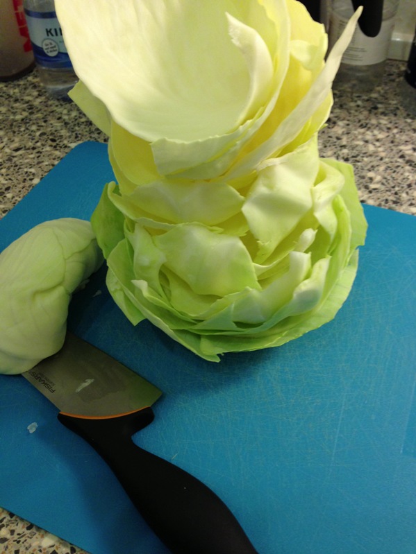 1 hvidkåls hoved (du kan også bruge fintsnittet spidskål, og kom rå i, – Kassér stokken)